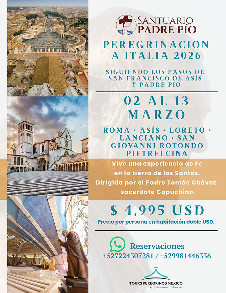 Emprende una peregrinación al corazón espiritual de Italia, acompañado por el Padre Tomás Chávez, sacerdote capuchino y director del Santuario del Padre Pío en México. Un recorrido de fe por Roma, Asís y San Giovanni Rotondo, donde los santos dejaron huellas de humildad, amor y servicio. Celebra la Eucaristía, comparte momentos de oración y vive una experiencia de renovación interior en la tierra de los santos.